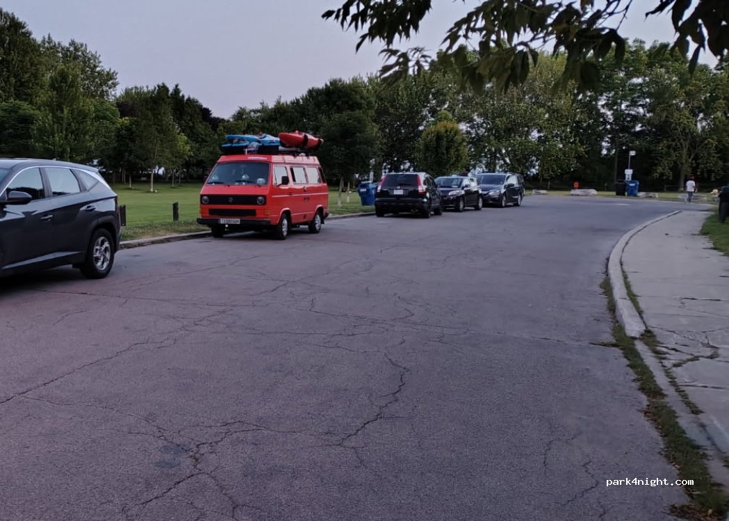 Parking along a street near a park. Small campers only. About 2 spaces. Very busy during the day. Friendly people. Feels safe. Be respectful and keep the area clean.