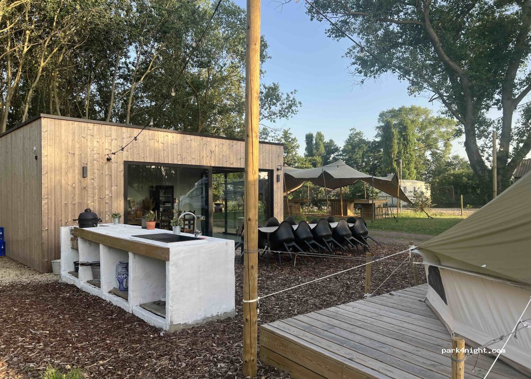 Quiet, green campsite on the Belgian coast (+/- 20 min. walk). Choice of glamping tent or pitches for the camper. Spacious pitches, possibility to stand between the trees for more shade (for an additional fee). Very cozy interior and with a beautiful, modern central building with kitchen, honesty bar and sanitary facilities. Also an outdoor kitchen, herb garden, ... Very friendly hostess. Really recommended!