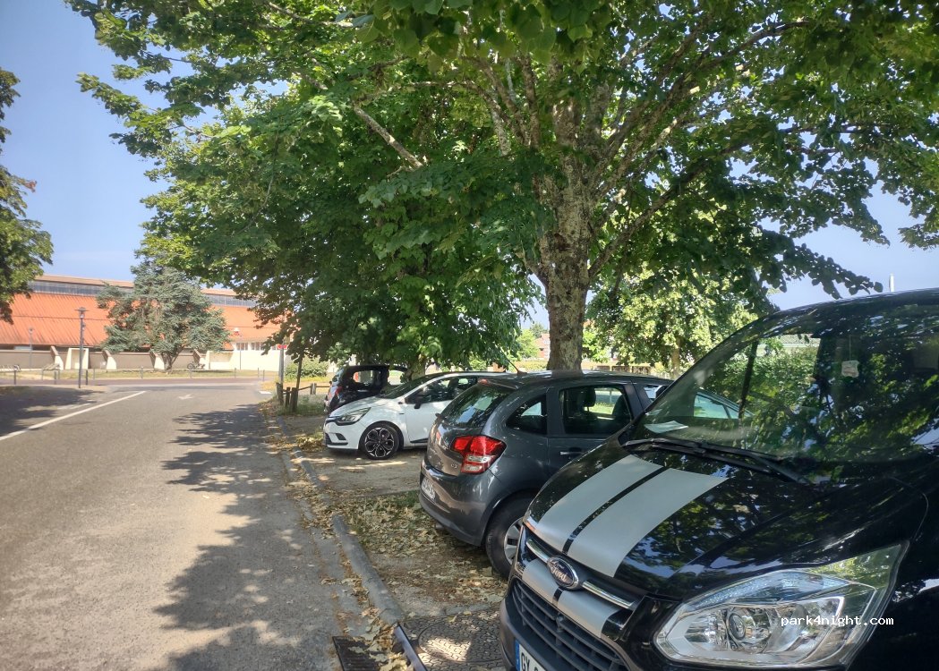 Quelques places de stationnement sous des arbres. Je ne sais pas si le stationnement est autorisé la nuit, aucun panneau d'interdiction visible. Idéal en journée. La taille est principalement adaptée aux fourgonnettes.