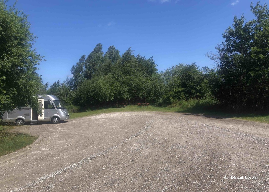 Nice little spot, with 3 picnic tables and a wastebin. Room for 2-3 AC. A bird tower 300 m away. A little noise from the road, and railway crossing, but nothing serious …