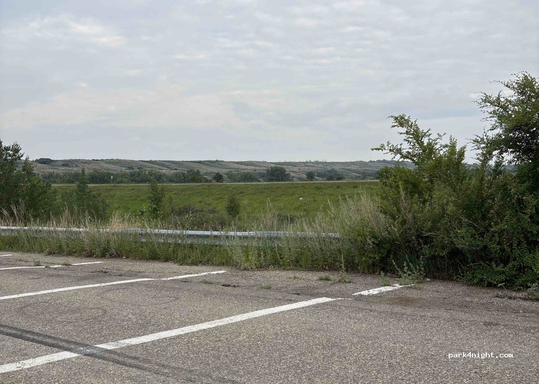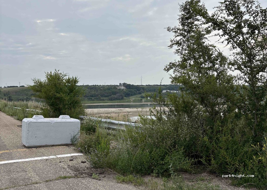 Aparcamiento cerca de un puente en desuso (ahora solo para peatones). Hay otro puente cerca, pero hay poco tráfico nocturno. Se accede a una pequeña playa por un sendero a la derecha.