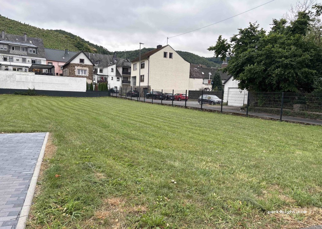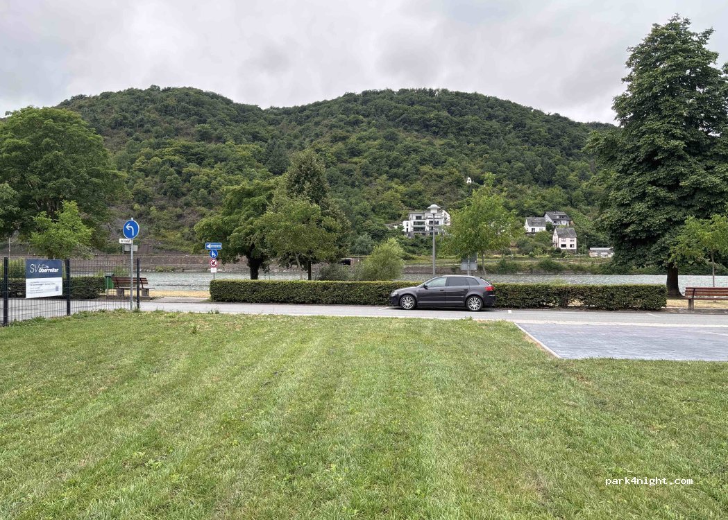 Kun en græsplæne. Lidt svært at komme til og ingen skiltning. 20 euro pr nat. Ingen service. Man må ikke holde, så man kan bruge fliserne ved sin dør. Det er kun til privat brug. Men første række med udsyn til Mosel. Fint område at gå tur i. Vi spiste på en lille udendørs restaurant lige ved kanten af Mosel. Fik Den store tapas, smagte fantastisk.