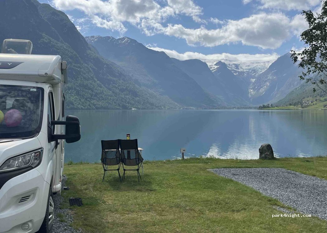 Olden campsite on the glacier road, right next to the Girta campsite (a little more expensive but smaller and better located pitches facing the glacier). Self-service boat with life jackets. Barbecues and picnic tables. Impeccable sanitary facilities