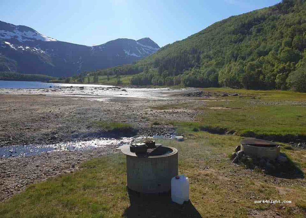 Shelter with picnic area. Outdoor toilet on the upper side of the gravel road in the forest. Feel free to stay the night or have a rest and cook, but take your trash with you after your visit. Narrow and steep road down from the main road to the place, which is not passable in the wintertime. Not drinkable water in the nearest creek. Drinking water in a stream a little further to the right towards the quay. The area is located in the Beach Zone, and this can be used by anyone.