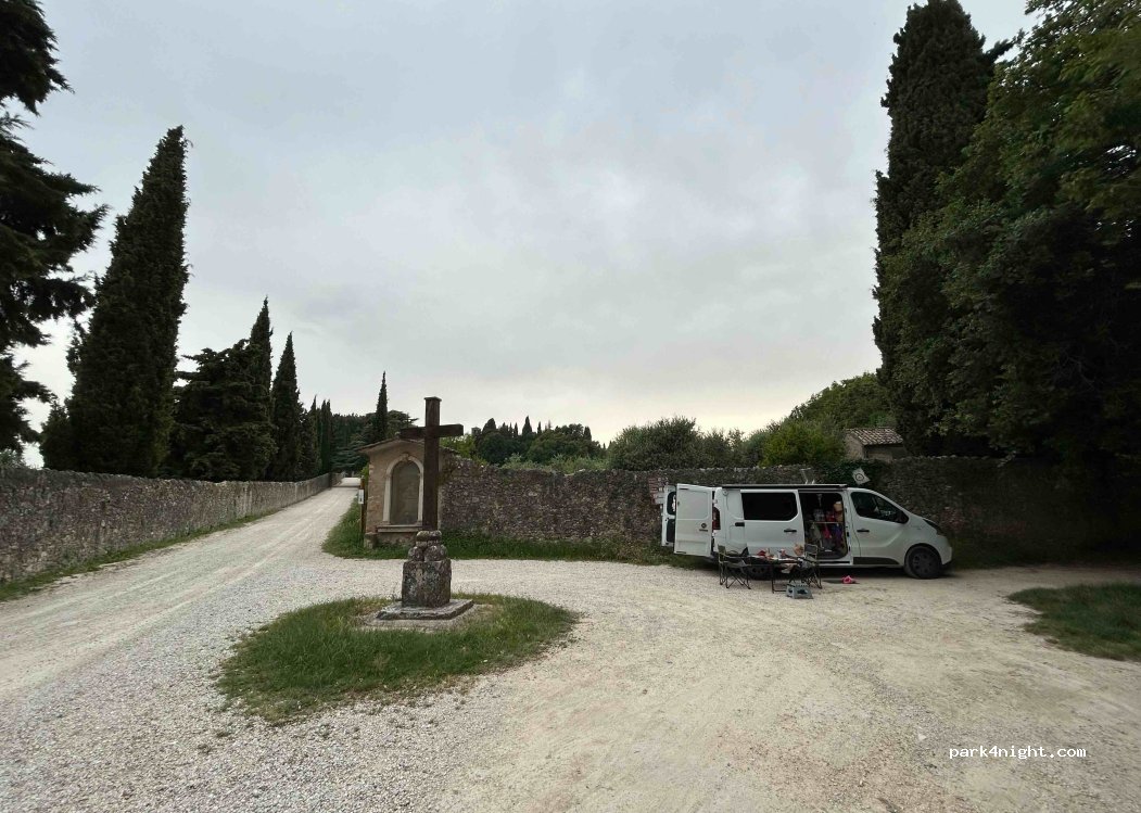 Il s’agit d’une petite place avant le monastère avec de quoi stationner 1-2 véhicules. Spot sympathique car calme pour la nuit, presque plat et petite vue pas loin a pied. Quelques passages de randonneurs le matin mais pas de problème particulier.