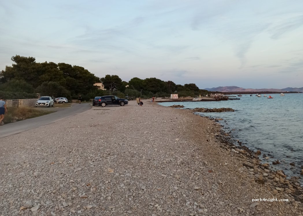 Parking gratuit pour voitures, camionnettes et camping-cars (selon notre estimation, la longueur devrait être suffisante), au niveau du sol, au bord de l'eau. Il suffit de garer sa voiture au bord de la mer. Sinon, la plage est réservée aux visiteurs d'un jour, avec un petit bar. Des douches gratuites sont disponibles sur la plage. Il y a aussi un camping officiel juste à côté, avec eau et électricité, ce qui pourrait être plus pratique pour les camping-cars. C'est agréable et calme, sans routes bruyantes à proximité, et le chemin d'accès est goudronné. Personne n'a été dérangé par nous, à part les baigneurs qui nous surveillaient sans cesse.