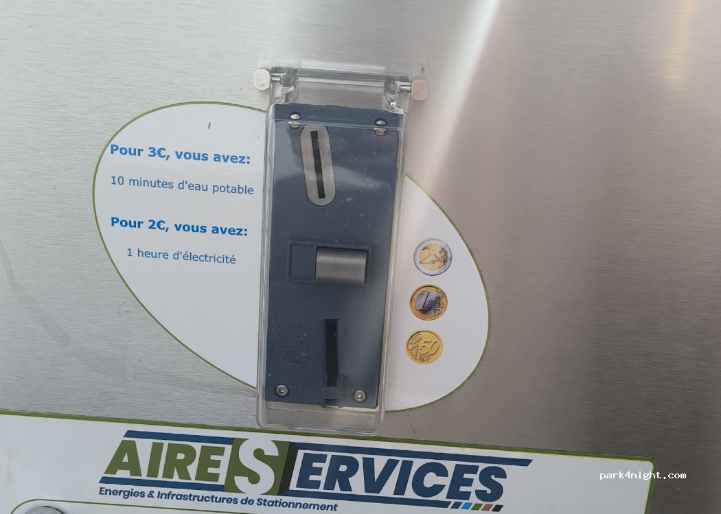 Usamos el servicio de electricidad y funcionó muy bien, pero el precio correcto es de 2€ por 1 hora. Sólo admite monedas. El vaciado de aguas negras y grises es gratis. Cuidado porque para vaciar el cassette se hace en la parte posterior del terminal y no lo indica.