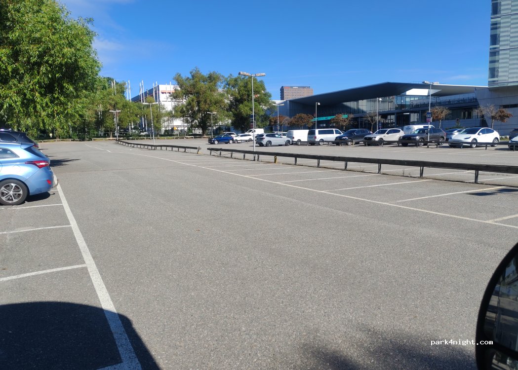 Parked here for 2 nights in a 7m motorhome. parked in a corner so out of the way, but this was a very empty lot. Some traffic noise but no worse than the 400SEK pn site on the other site of the event centre. 3 min walk to train station. 10min trip to Central. Willys supermarket 5min walk.