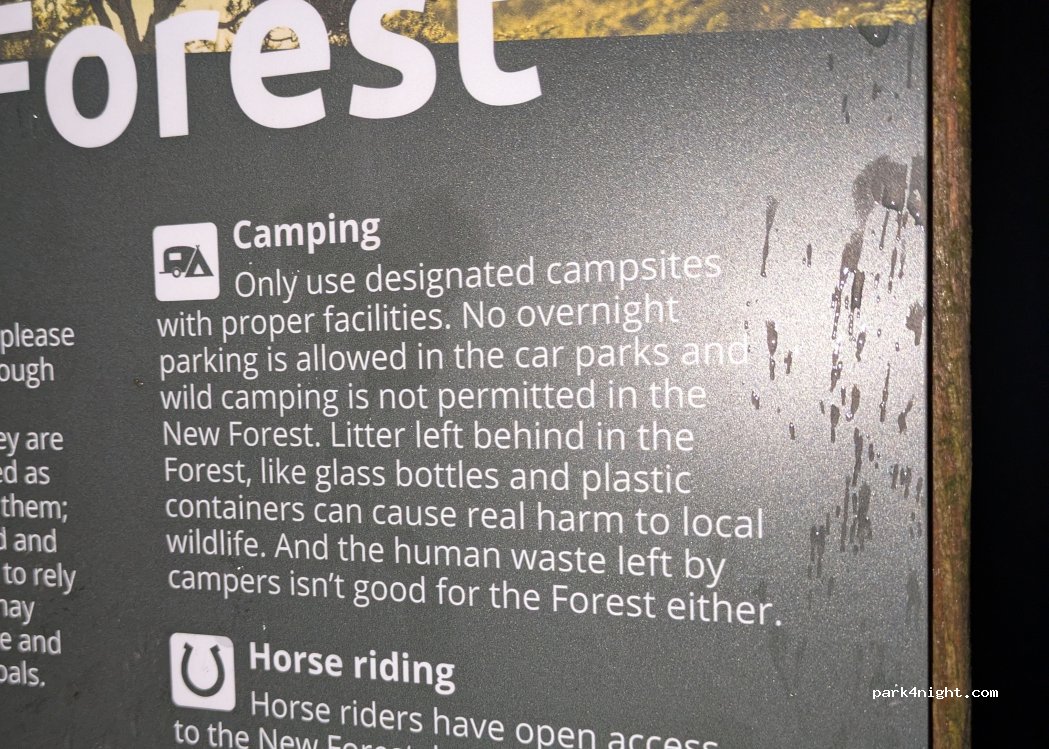 Juste à côté de la route principale qui quitte New Forest, au rond-point Tesco sur la rocade de Hythe, un parking sans barrière ni limite de hauteur est ouvert au public. C'est un endroit populaire auprès des promeneurs de chiens. L'entrée est un peu cahoteuse et pleine de nids-de-poule, mais s'aplanit pour devenir un parking en gravier durci, entouré de nombreux grands arbres. Pas d'eau ni d'assainissement, et les feux ouverts et les barbecues sont interdits.