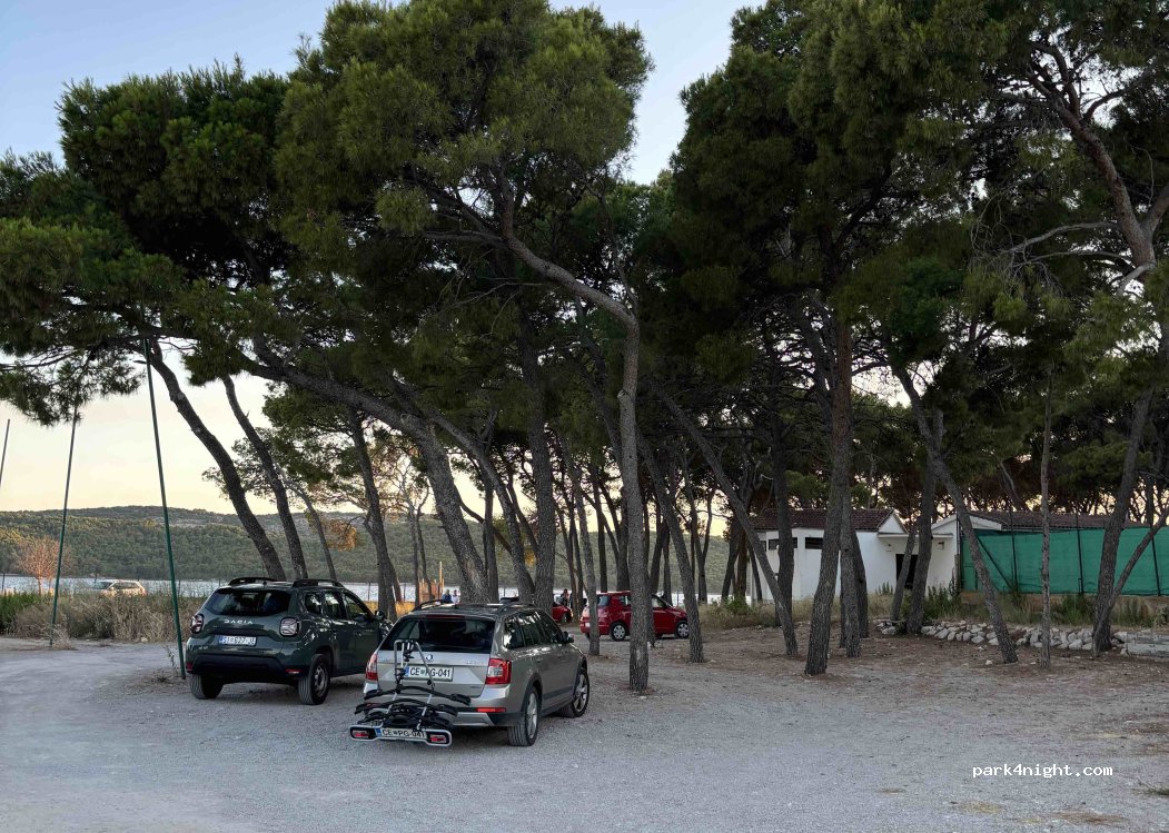 Ein großer, kostenloser, wunderschöner Parkplatz an einem kleinen Park/Waldgebiet mit öffentlichen Toiletten (die geschlossen waren), direkt neben dem öffentlichen Strand mit kristallklarem Wasser und Duschen. Ein paar Meter entfernt gibt es ein Restaurant (das mir nicht gut tat). Es gibt keine Verbotsschilder.