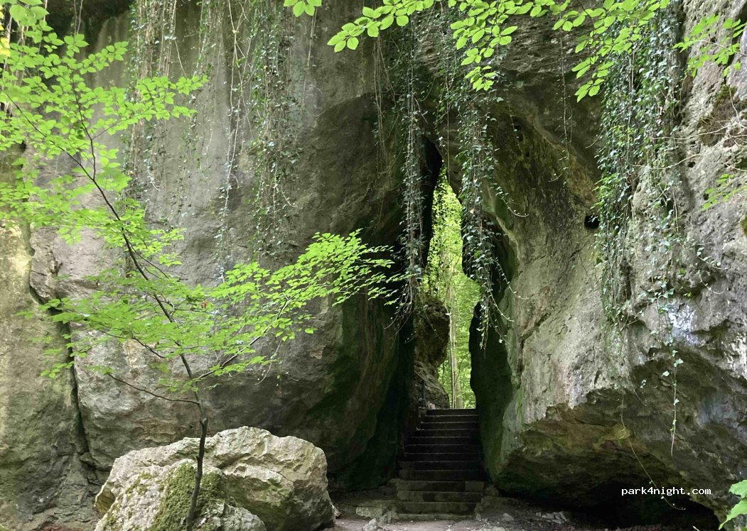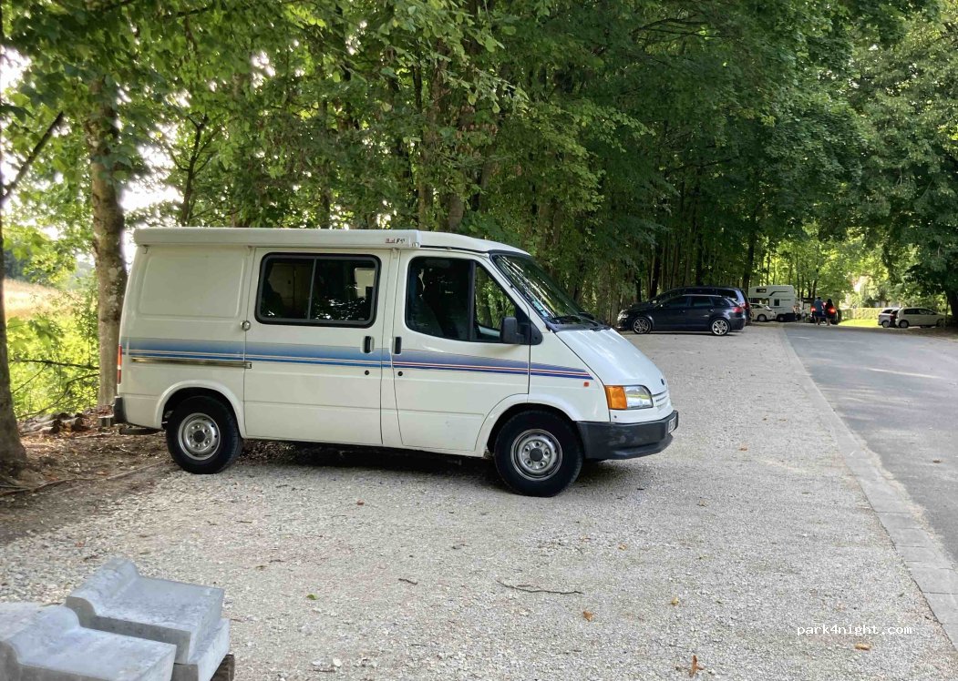 Petit parking d’un château gratuit avec un joli parc où il y a de gros rochers ,des grottes. Endroit super sympa au calme et nous allons y passer la nuit.