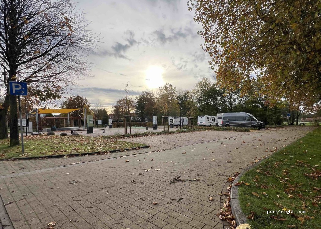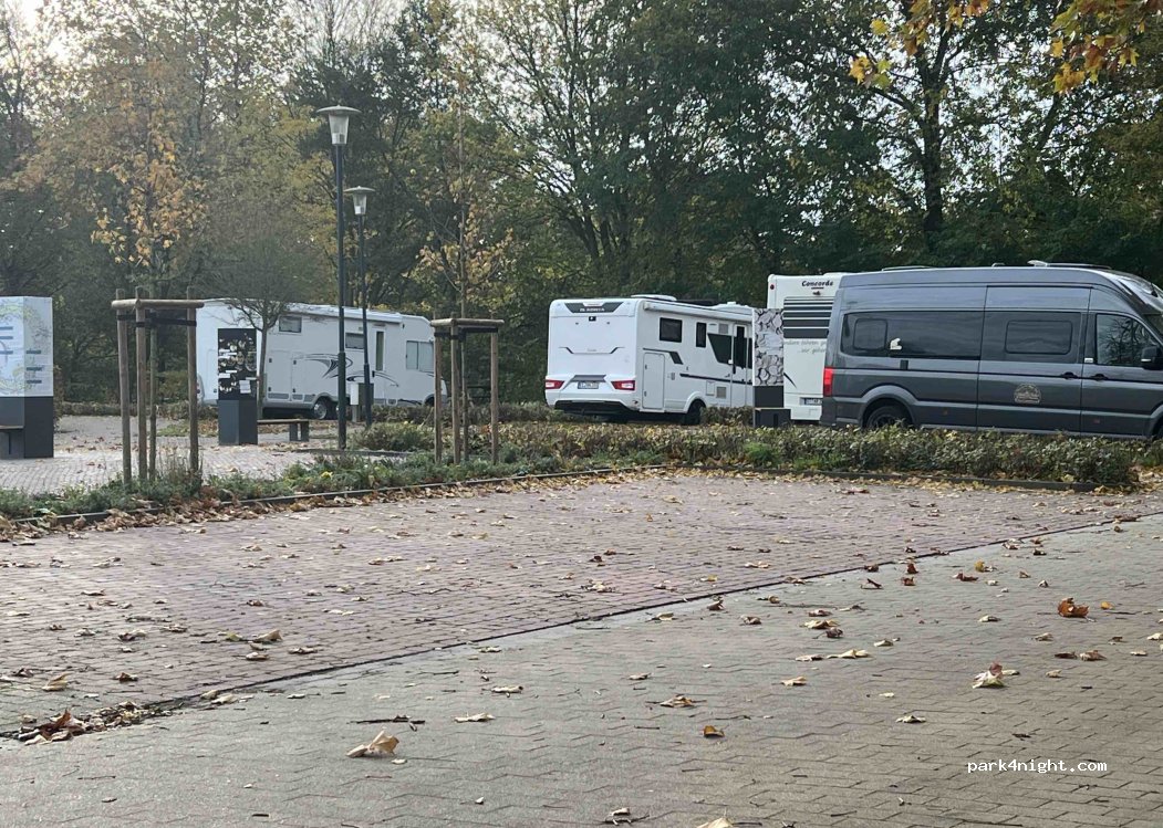 Un parking pavé et gratuit, composé de neuf places individuelles, est bordé de haies basses de rosiers sauvages. L'emplacement est gratuit. L'électricité est payante. Le Wi-Fi gratuit est disponible depuis peu autour de l'église FeG Hesel. L'espace est donc généreux.