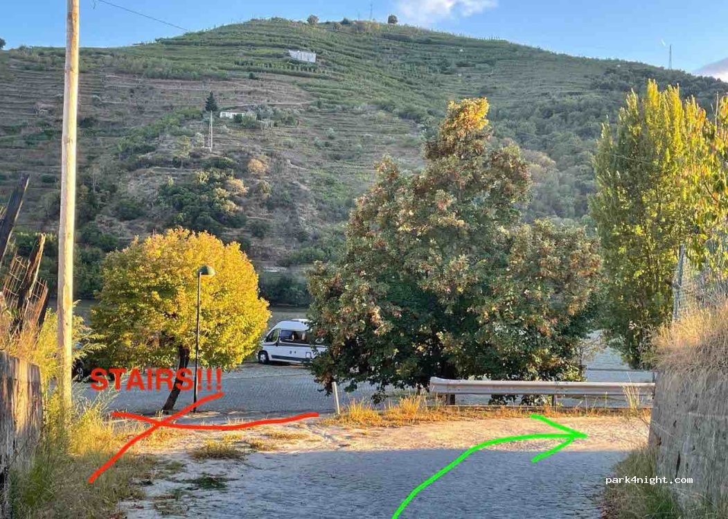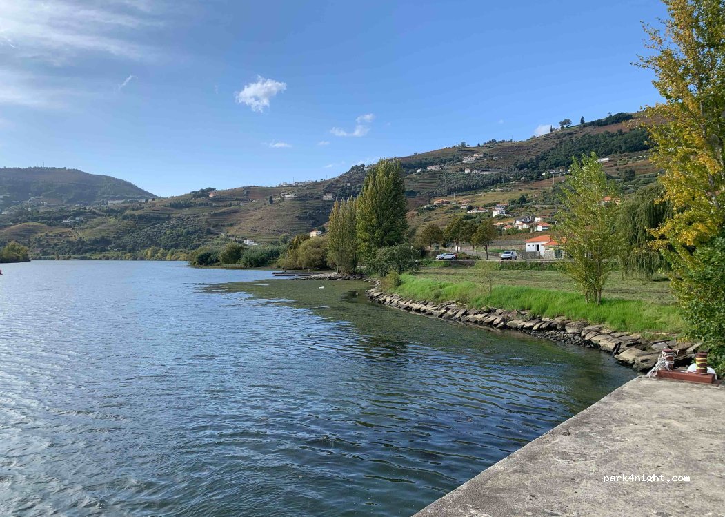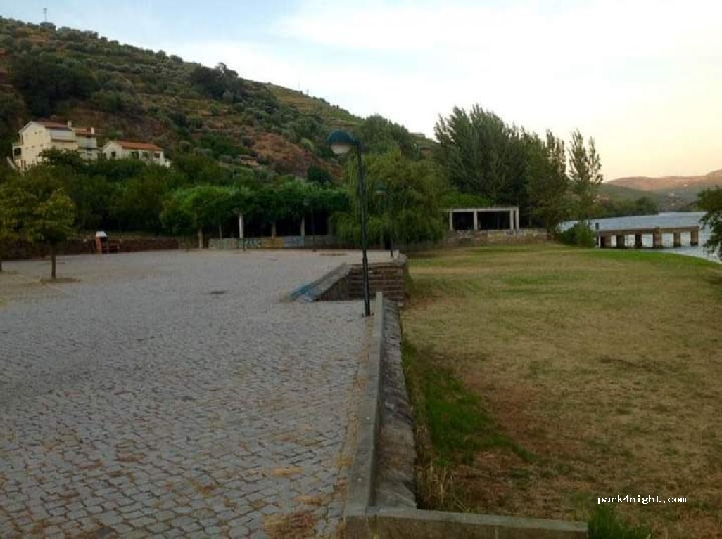 Public free flat illuminated P at the Douro river’s edge (river beach) with a nice view. Three stone picnic tables+seats under long shadowed lane + grill. Surely quiet on weekday’s but beware on Saturday night till 04.00 music in the bar nearby. 7 min walking till interesting small museum of interpretative center of “rabêlo” boat (= “Centro Interpretativo do Barco Rabêlo”) with info also in English; “rabêlo” boat was a wooden sailing type adequate to run along wild Douro river without dams, to transport wine barrels for centuries. NOTE: short steep climb-stripe on W access, also narrow (possible crossing vehicles at railway station park); to went out prefer turn right on T top of stone street (not steep). Toilets and showers available in self service maybe only in summertime.