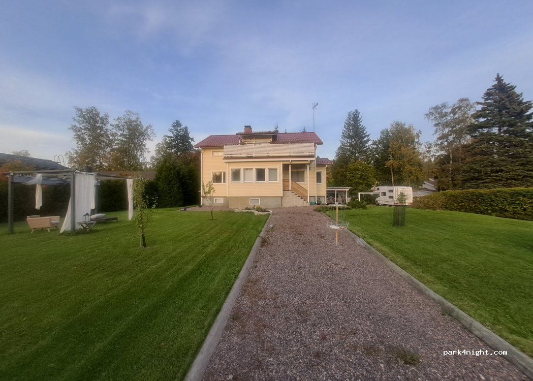 Gebührenpflichtiger Parkplatz auf Privatgrundstück. Im Hof eines freistehenden Hauses befinden sich zwei Parkmöglichkeiten für Wohnmobile oder kleine Anhänger – eine davon auf Rasen.