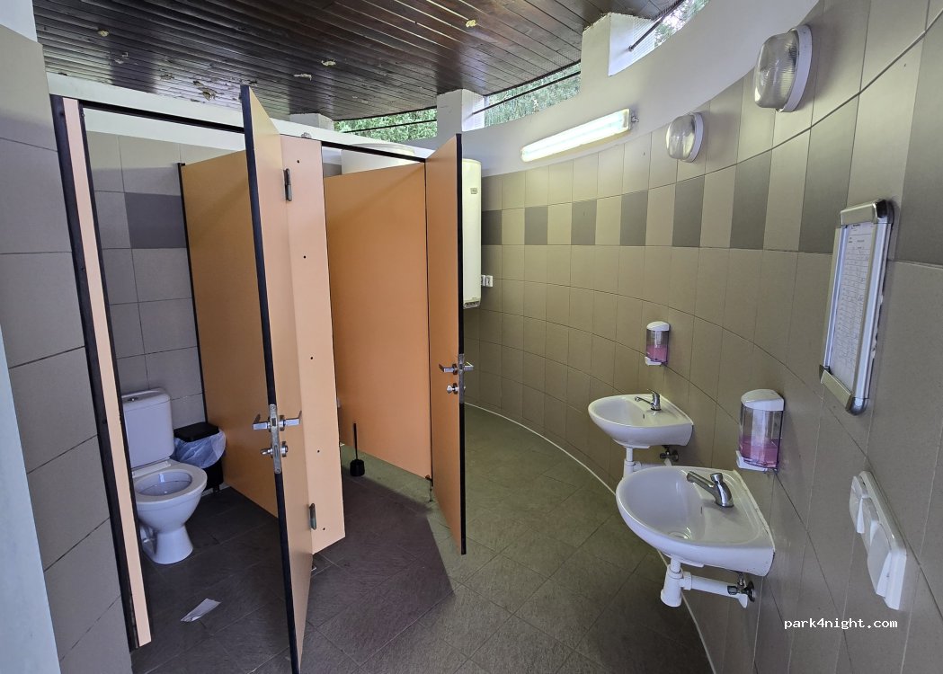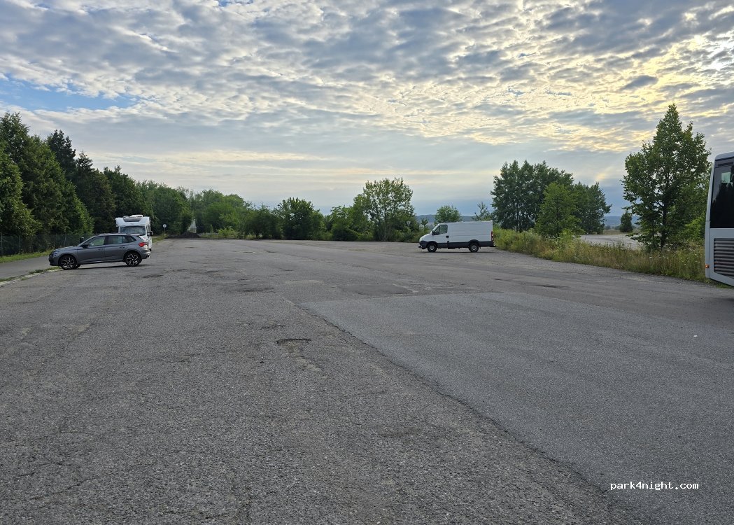 Unrestricted parking lot next to an outdoor leisure park. Swimming lake, pumptrack, kiosks with food and drinks, playgrounds, volleyball court, 2 trempolines, inline skates track. Toilets are fair and regularly cleaned. The parking is next to a mid sized road with some traffic but not too noisy. A decent place to hang out and park4night. Check Google for more photos and reviews.