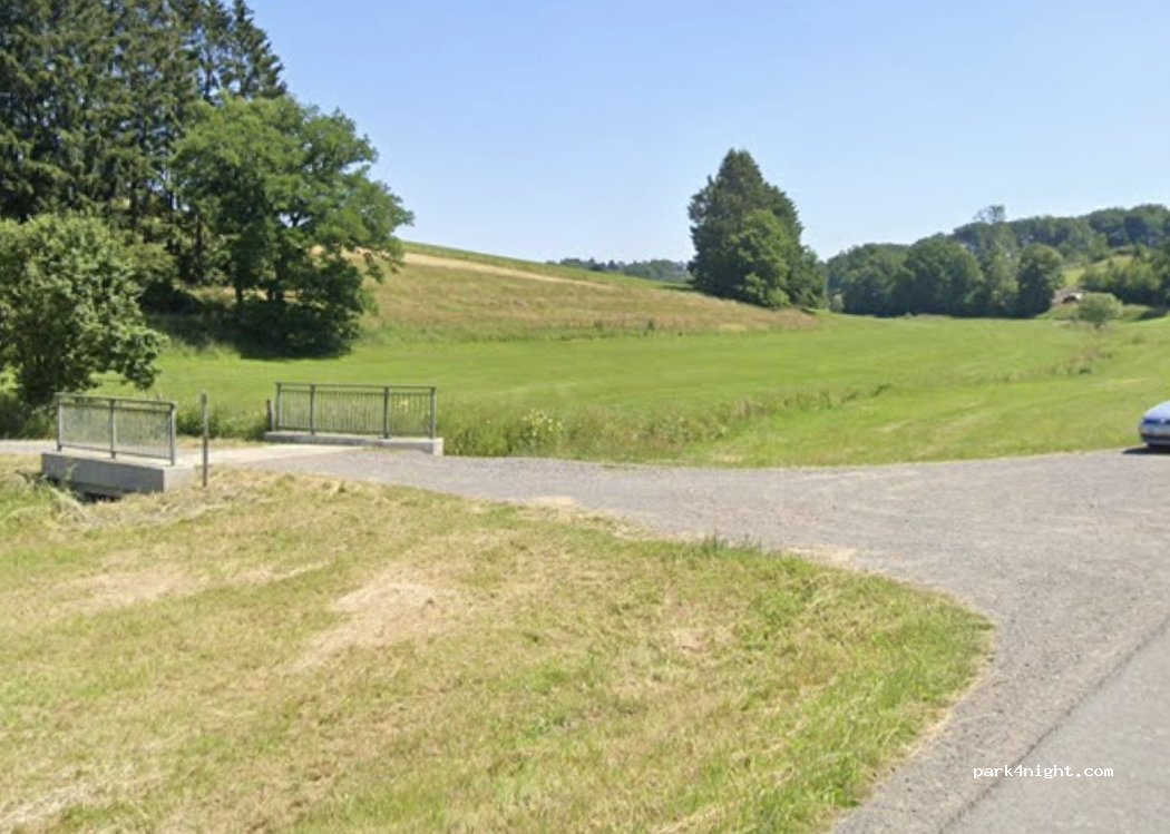 Espace gravillonné en bord de route, entre champs et prairies, avec un sentier de randonnée. La boutique de la ferme Büchermühle propose du café, des confitures, des gâteaux faits maison et bien plus encore.
