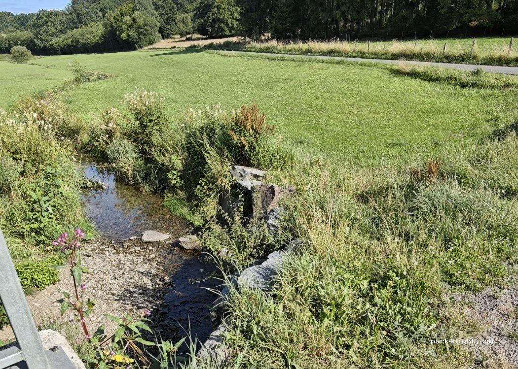 Zona de grava junto a la carretera, entre campos y prados, con una ruta de senderismo. La tienda de la granja Büchermühle ofrece café casero, mermelada, pasteles y mucho más.