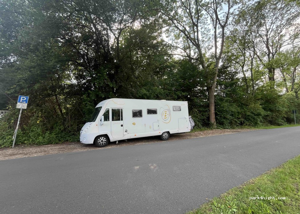 Plusieurs places de parc en bordure de route à sens unique. Pas de restriction. Ok pour véhicule long. Pas de service. Idéal pour une nuit (calme). À proximité d’un centre sportif. Supermarché avec boulangerie à 10 min à pieds.