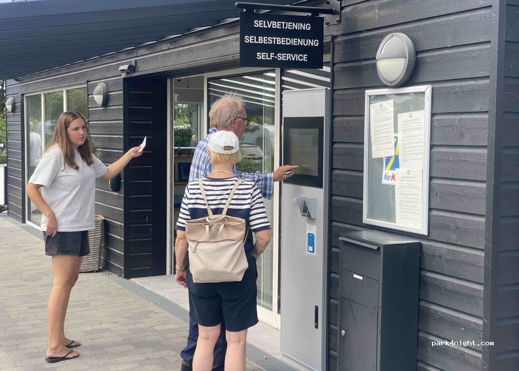 Motorhome parking is on the left side by the entrance. It has a dedicated self check-in/out touch panel next to the reception. Additionally, you prepay money for electricity and showers/laundry. To get remaining balance back you have to do the check-out. Double check if money are actually back - I had to email them.