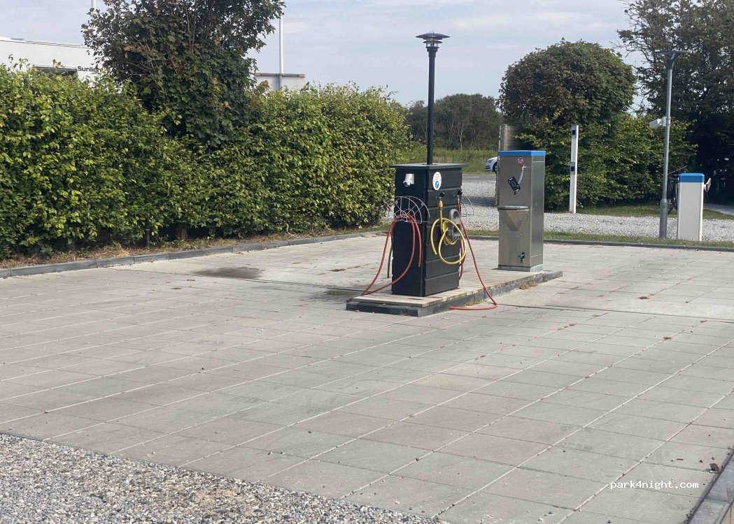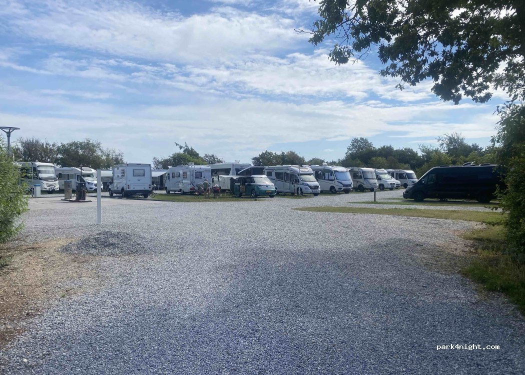 Área que pertenece al camping. plazas con césped. Vaciado y llenado de aguas.. 180 DKK una noche (salida hasta las 12:00). check in en la máquina (te retienen 100 DKK por si utilizas las duchas y 100 DKK por si utilizas electricidad) si no lo utilizas te lo devuelven al hacer el check out. El check out se hace también en la máquina. Pagamos con tarjeta. Tienes código para electricidad y duchas.