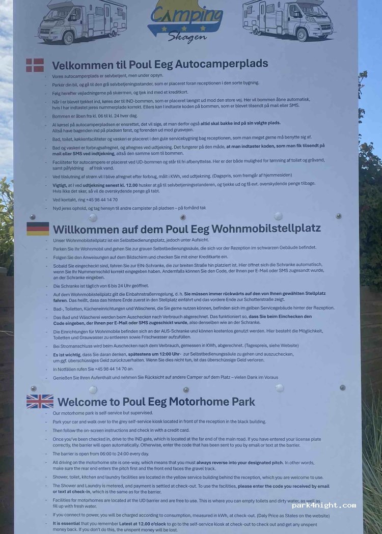 Top schöner Stellplatz. Wenn man ein Problem hat kann man jederzeit einen Mitarbeiter von Poul Eeg kontaktieren. Auch am Samstag um 21 Uhr. War Super freundlich und hilfsbereit. Toller Ausgangspunkt für die Umgebung oder auch Stadt Skagen. Dienstleistung wird tatsächlich nach Bedarf abgerechnet und beim auschecken umgehend rückgebucht. Alles in allem Top.