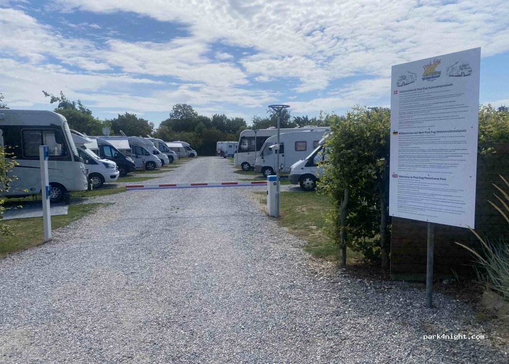 Aire de camping-cars flambant neuve, en partenariat avec le camping Poul Eeg, ouverte toute l'année. Tarifs adaptés aux camping-cars : 190 DKK pour le stationnement, 6 DKK/kwt pour l'électricité, 100 DKK pour le lave-linge et les douches. L'arrivée se fait par prépaiement et si vous n'utilisez pas les douches, le lave-linge ou l'électricité, le montant est remboursé sur votre carte au moment du départ. C'est un véritable luxe : une immense aire de jeux pour enfants et une épicerie sont à votre disposition. Possibilité de barbecue sur place.