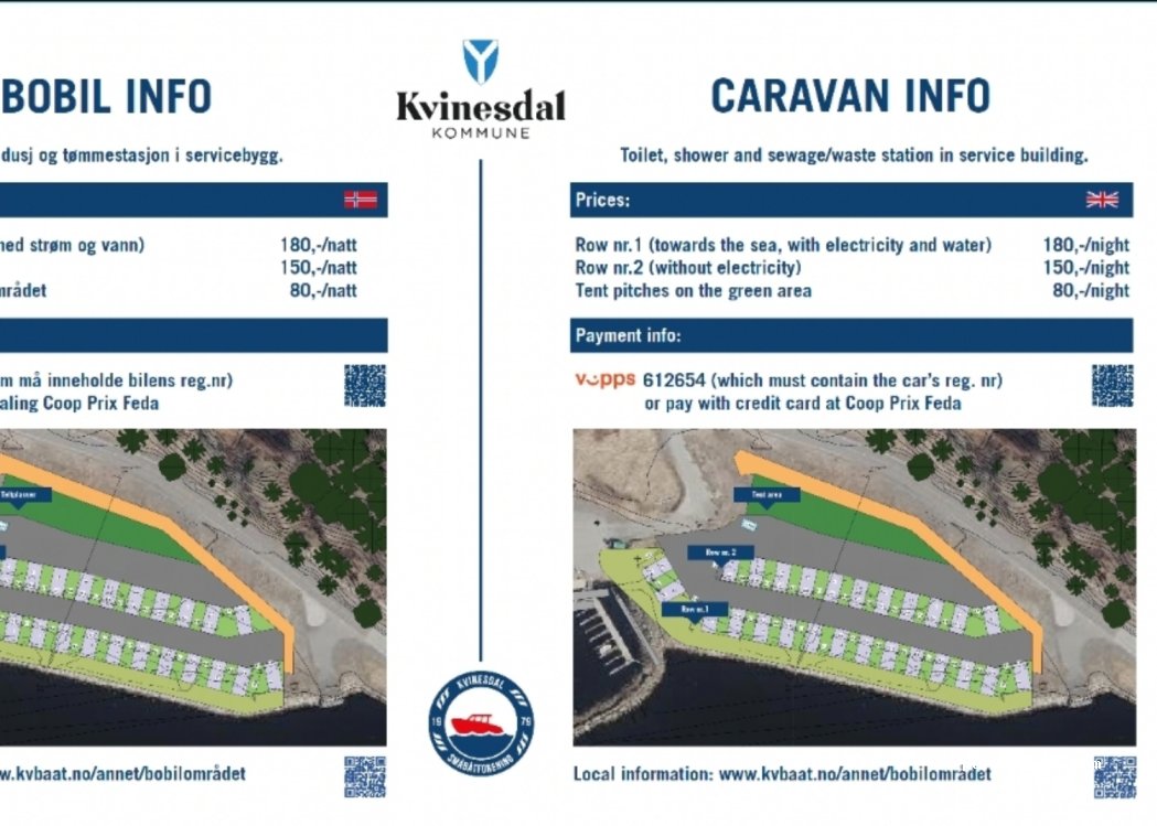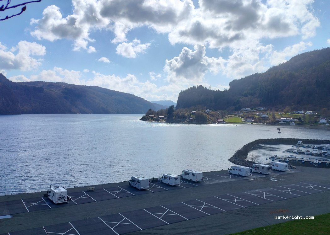 Perfekter Stellplatz! Genialer Blick aufs Wasser. Unmittelbare Nähe zur E39. Dusche und WC (je 1x vorhanden) super sauber, besser als auf manchem Campingplatz. Frischwasser und Müllentsorgung im Hafenbereich. Bezahlung von 100 NOK im coop Markt (zirka 500m im Ort) auch mit Karte möglich. Netter kleiner Ort.