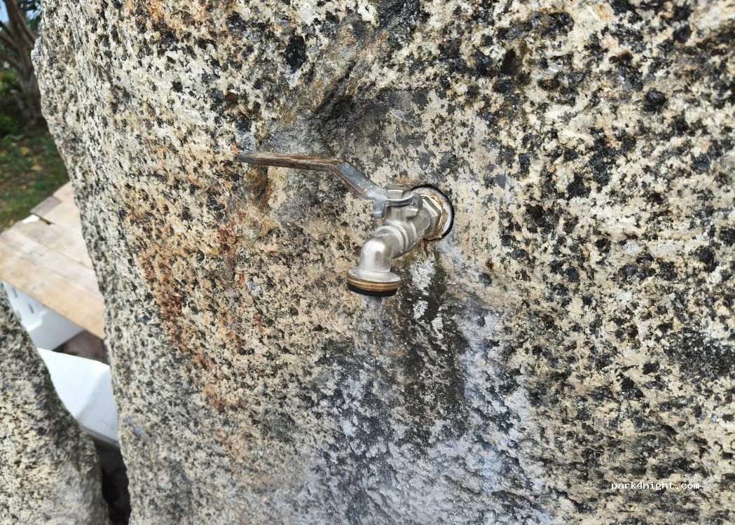 Robinet pour remplir les réservoirs d'eau. L'eau n'est pas potable, mais on peut s'en servir pour se laver. Stationnement facile.