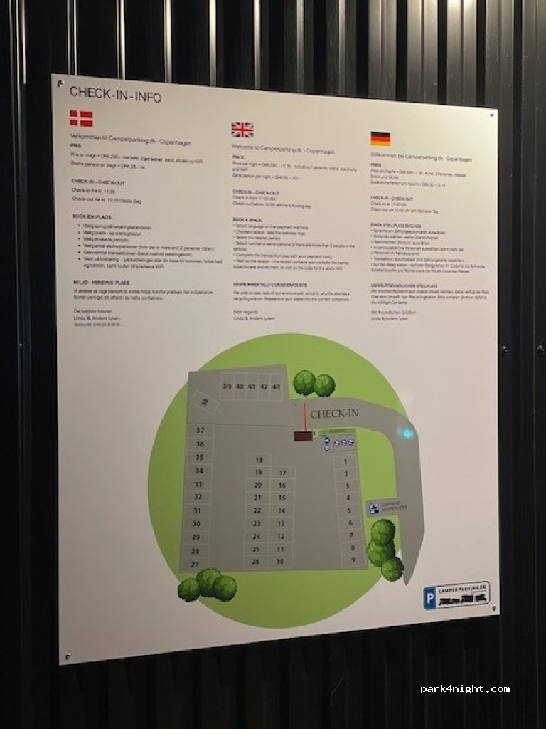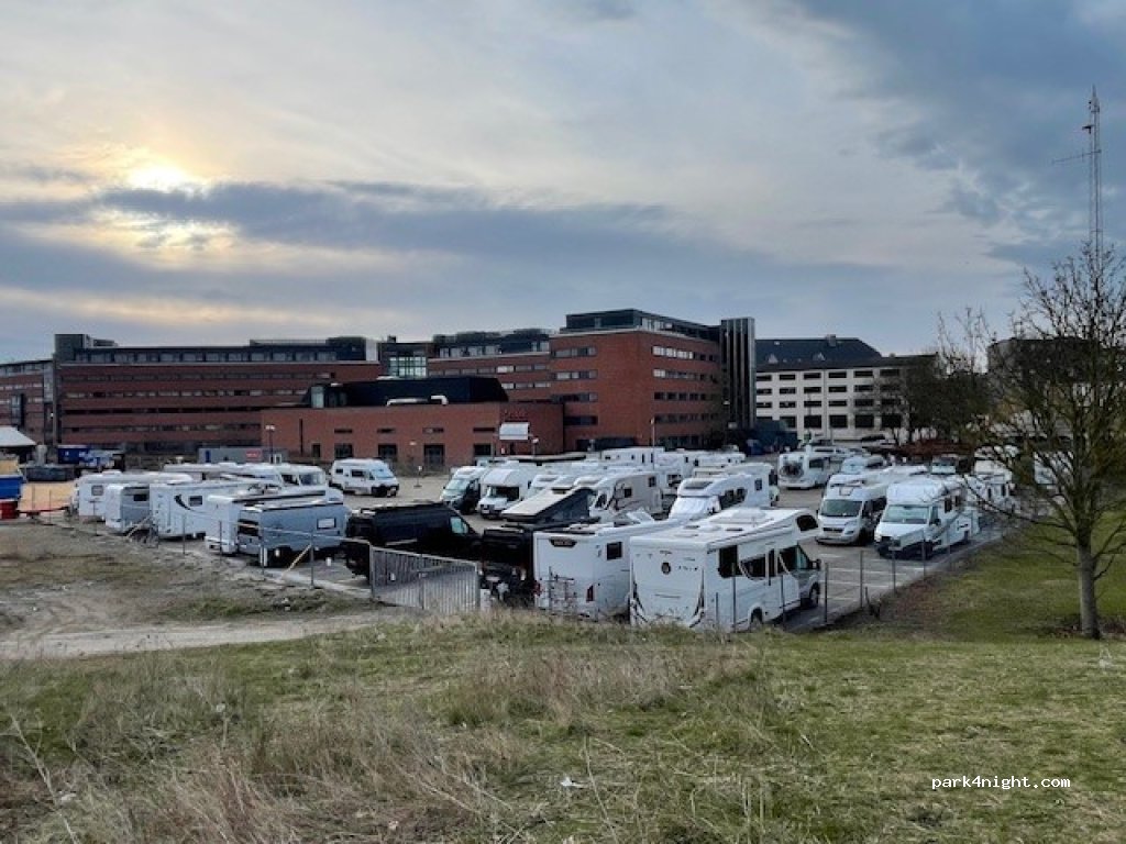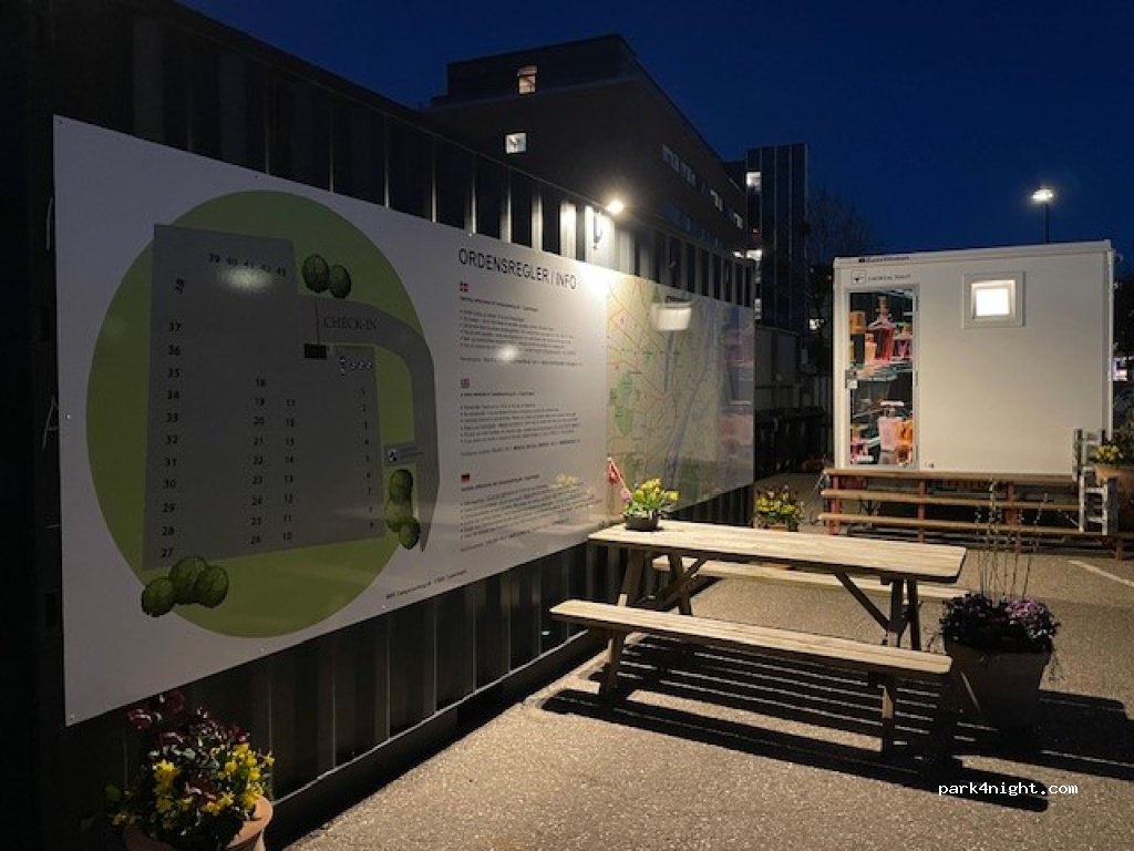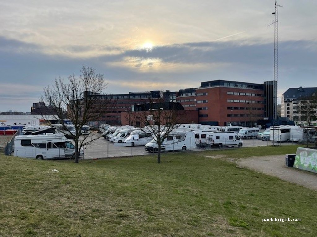 Large parking area for motorhomes in the heart of Copenhagen. 43 spaces (appoximately 3,5 x 8 meters each)