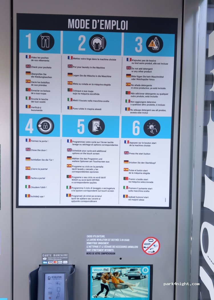 Wash 5€/9kg, 12€/20kg, 3€ /20kg dryer