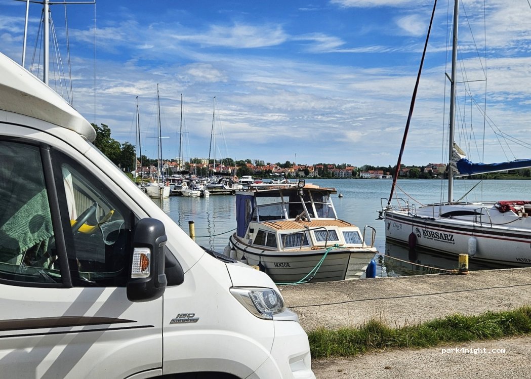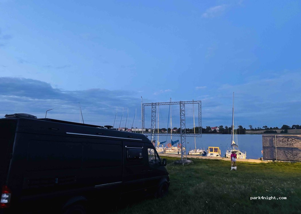 Polecam, parking wewnątrz portu Ryn, prysznice płatne 5zl , toalety free