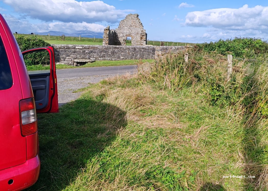 Small parking in front of the church facing the Dundrum Bay with the Morne Mountains in the background.