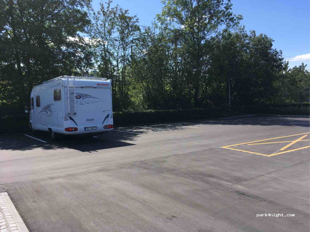 Zentrumsnaher Parkplatz. Zwischen Bahnlinie und Straßen gelegen sind entsprechende Geräusche vorhanden. Ebenes, geteertes, teils schattiges Gelände. Kein Service aber kostenlos. Aufgrund einer temporären Baustelle (08.2018) nur drei Parkbuchten mit Überlänge, sie sind im hinteren Bereich.