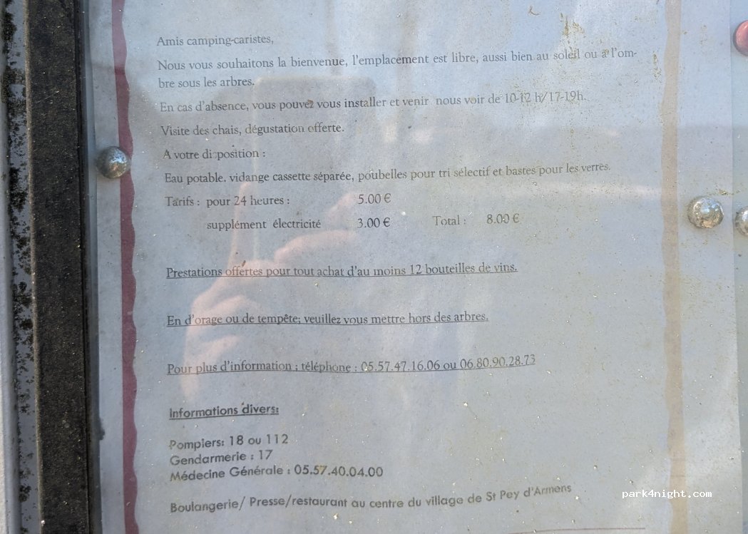 Le propriétaire nous a dit allez vous installer j arrive dans 15 min ...ne le voyant pas venir nous avons été vers lui et il nous a.dit on se voit demain maintenant je mange c est trop tard ...il était je pense 18h ...on est partis au camping au bord de la Dordogne un peu plus loin et plus sympa...on voulait juste passer une nuit et pouvoir vidanger bref dommage