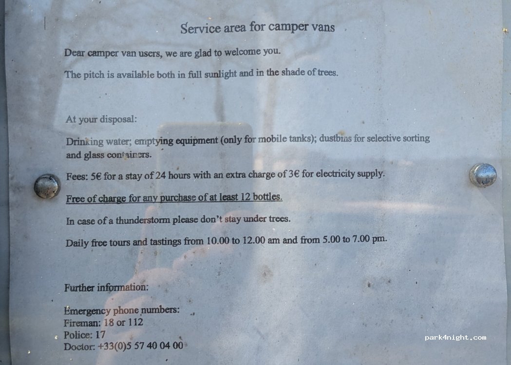 belle endroit pour passer une bonne soirée et nuit au calme dans ce vignoble. la nuit avec électricité et eaux puis vidange pour 5€. faite lui plaisir et profiter pour déguster un bon st emilion.