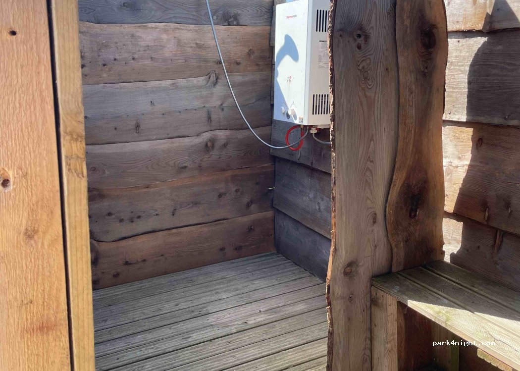 Eine Außendusche, zwei Waschbecken und vier saubere Toilettenkabinen stehen zur Verfügung.