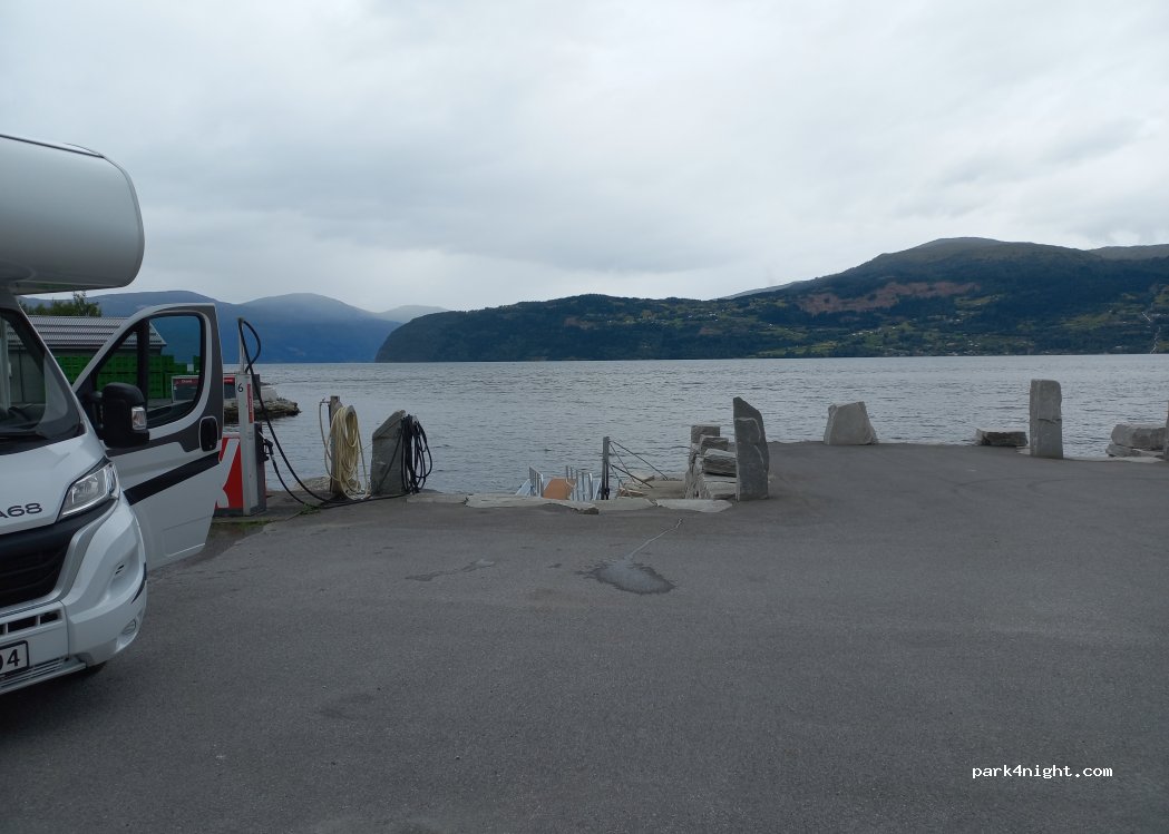 Derriere la supérette tables de pique nique au bord du fjord avec tuyau d'eau. Interdiction d’y dormir la nuit.