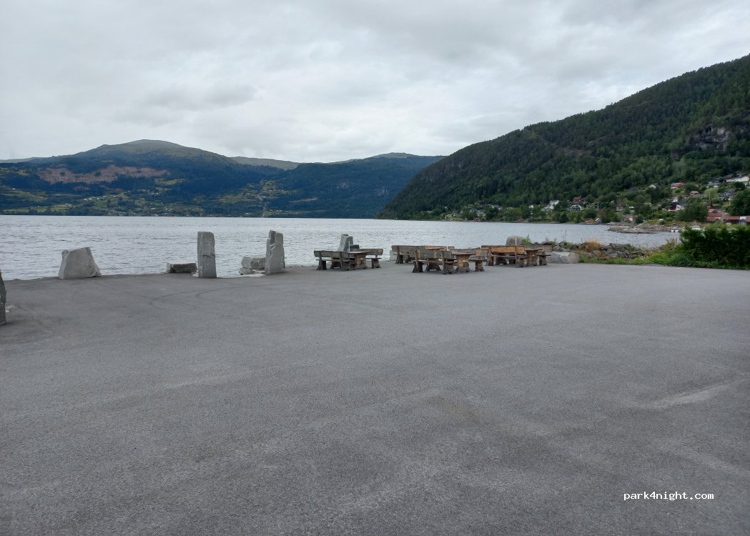 Behind the convenience store, there are picnic tables by the fjord with a water hose. It is forbidden to sleep there overnight.