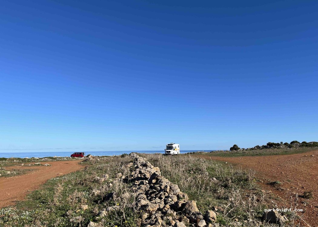 Great spot. The off road is a bit tough but doable with any car. If you don’t feel like going on because of the rocks, there are plenty of spots that are flat and where you can stop. We spent one night here. There was another van and in the morning a car arrived with two guys who went climbing. Night super quiet. The light from the lighthouse will keep you company. Access: take a turn right into the unpaved road before the village “Cala Rossa”