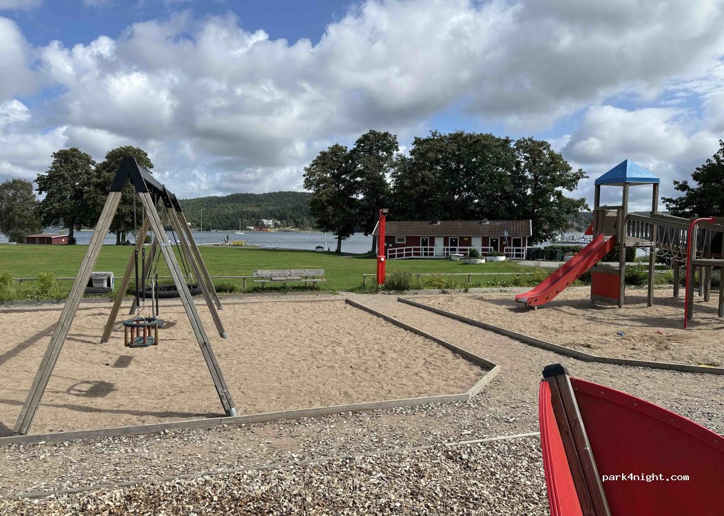 Parking at the public bathing area in Svanesund. Nice swimming area, seating, a playground, and public restrooms are available on site.