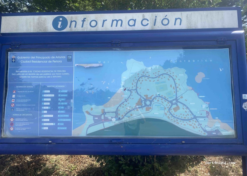 Parking para visitar el pueblo abandonado de perlora hay mesas para comer , barbacoas zona de baño etc creo que cierran por la noche porque hay una barrera con seguridad