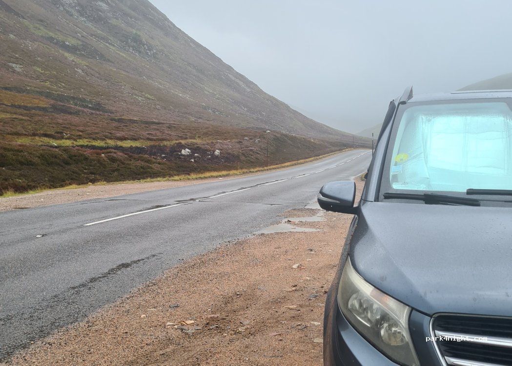 Kleiner Platz am Straßenrand, aber groß genug, um vom Verkehr zurückgesetzt zu sein. Zwei Transporter können dort parken. Unterhalb fließt ein kleiner Bach.