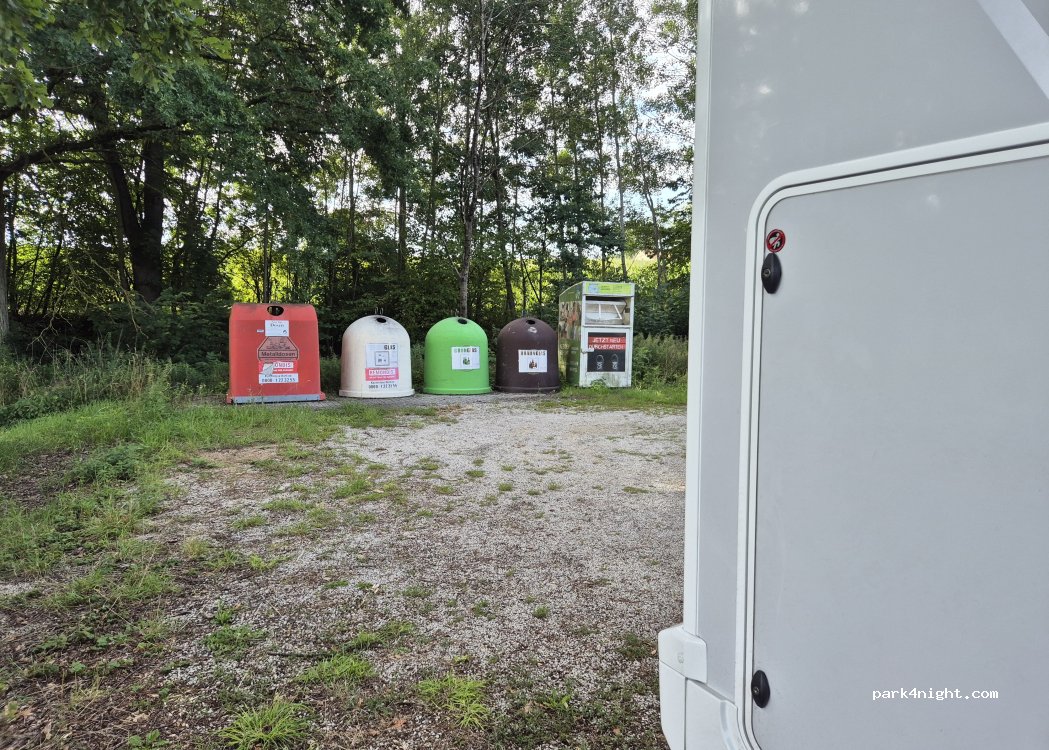 Un pequeño aparcamiento al final de una calle tranquila, ideal para una o dos campistas. Se encuentra en una zona tranquila, justo al borde de un campo, con asientos y cubos de basura. También hay algunos contenedores de reciclaje de vidrio.