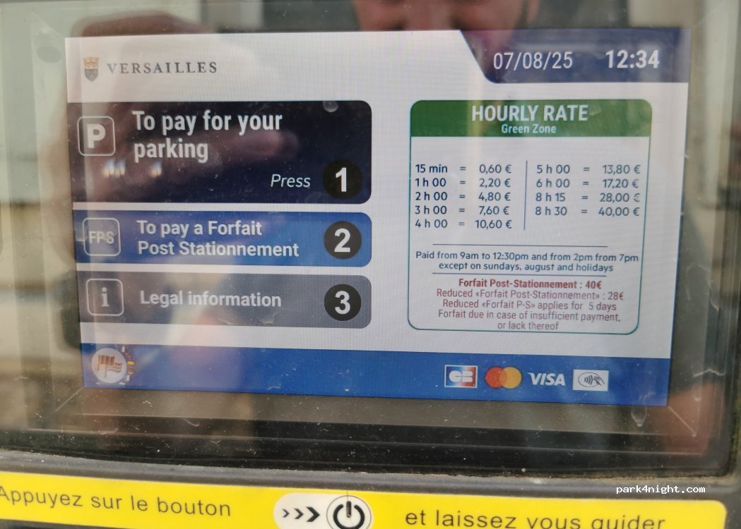 On-street parking, paid zone from 9:00 AM to 12:30 PM and from 2:00 PM to 7:00 PM, except Sundays, August, and holidays. Less than a 10-minute walk from the entrance to the Palace of Versailles. No height or length restrictions.