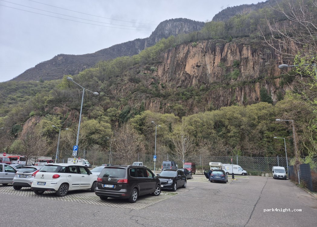 Parking du stade gratuit, en retrait de la route, où les italiens viennent s'entraînaient. Places en journée mais rempli le soir jusqu'à 21h environ. Ensuite les italiens partant il y a plein de places. Un peu d'ombre. Bolzano est accessible facilement en vélo, car une piste cyclable très bien aménagée y emmène. Commerces à proximité.