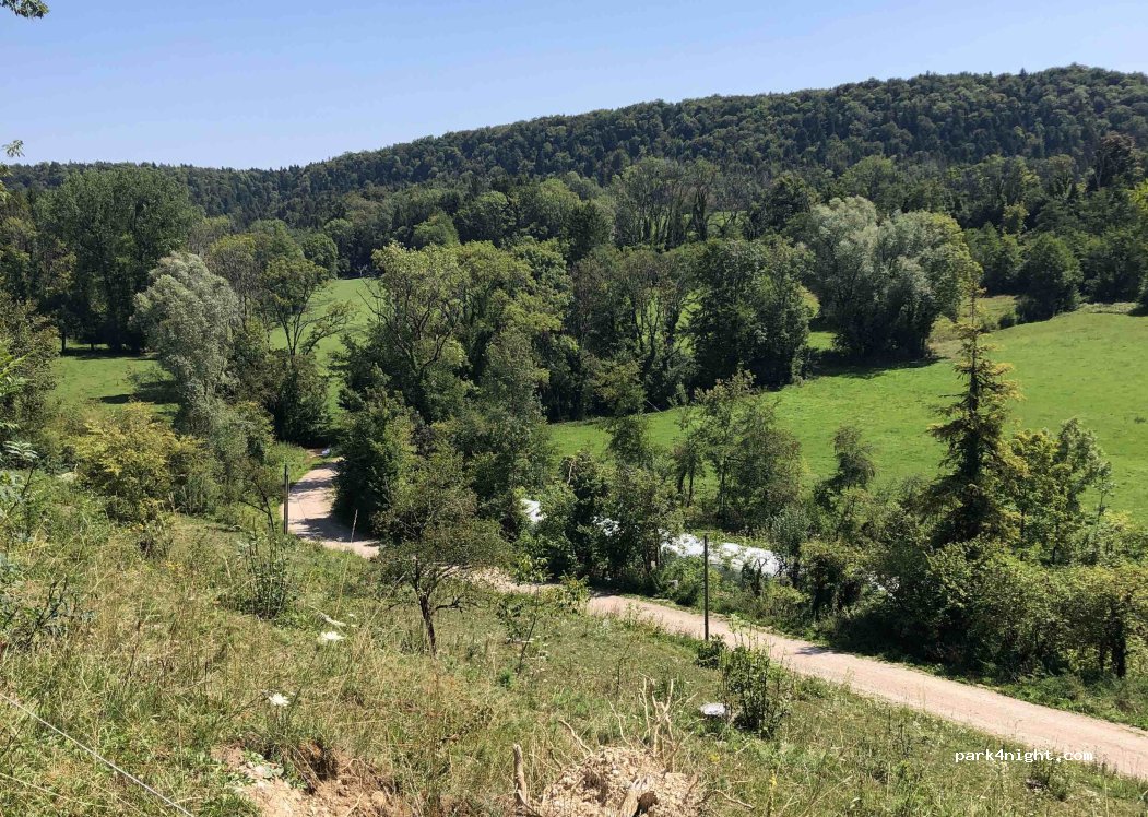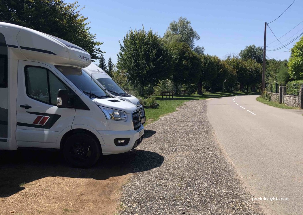 Parking de jour autorisé de 9h00 à 21h00 avec une table de pic-nic et 2 bancs pour 2 camping-car et vans. A 10 mn en vélo du lac de Chalain.
