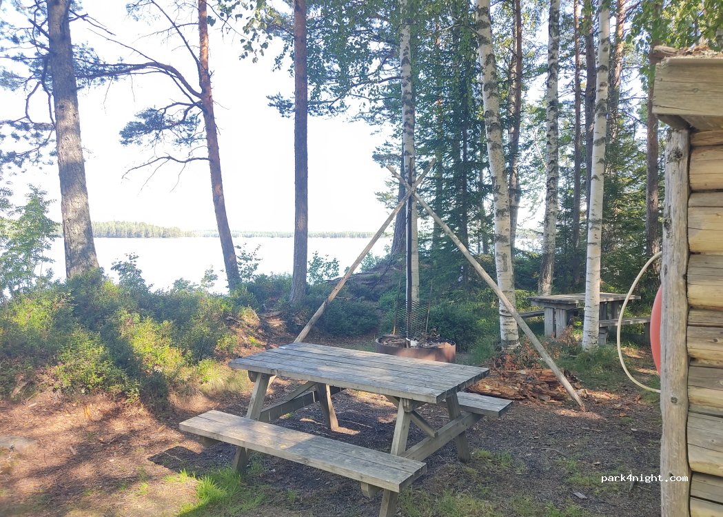 En bord de piste ( très peu de passage)espace aménagé avec deux tables de pique-nique,un foyer et un abri, en bordure du lac, petite plage de sable.
