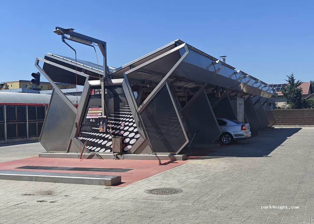 Place of self service car wash, vacuum cleaner etc. There is one washing spot on the side where you can drive taller cars. You can get tokens from the machine with card and cash.