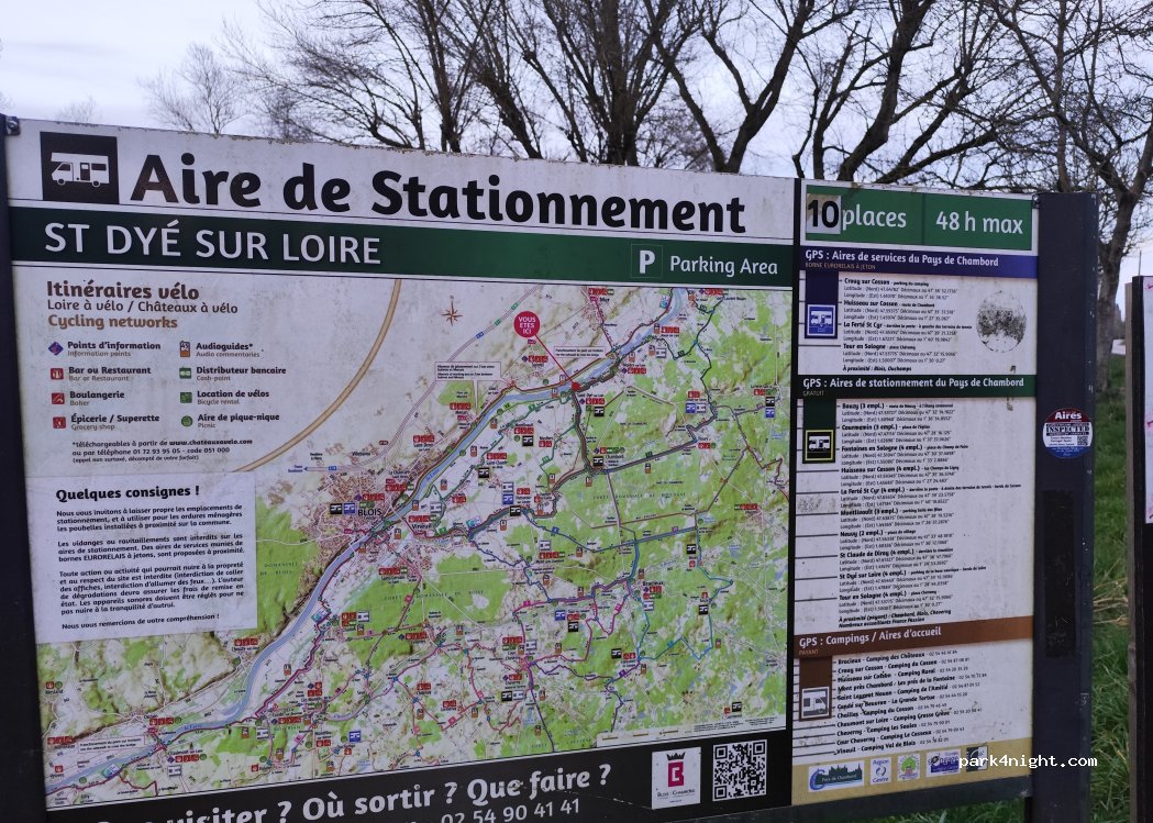 FREE MOTORHOME AREA 48h parking. No services .. just the Loire view, near the Canoës Kayaks center at the entrance to the village from BLOIS. Idyllic place for nature lovers. Quiet and perfect for bird watching on the river. You should know that without the port of St Dye, the Château de Chambord would not have been built !!!