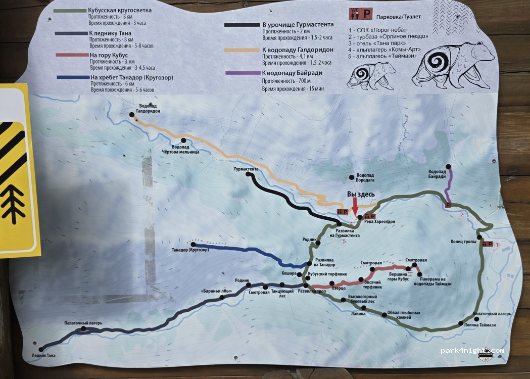В 200 метрах в сторону отеля ТанаПарк, есть общественный туалет, урны для мусора и ресторан. Много водопадов и организованных троп для прогулок разной сложности. В 2х километрах есть магазин, где можно купить всё необходимое.